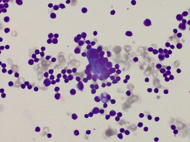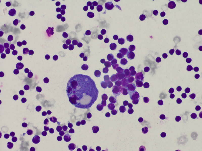 以淋巴细胞为参照物,大点的细胞应该是间皮细胞,有些退变,考虑良性。