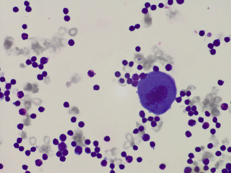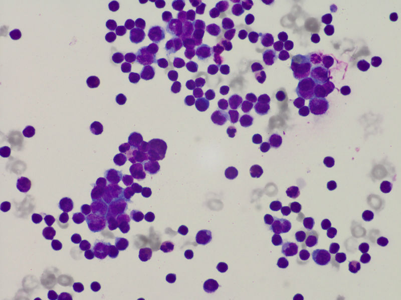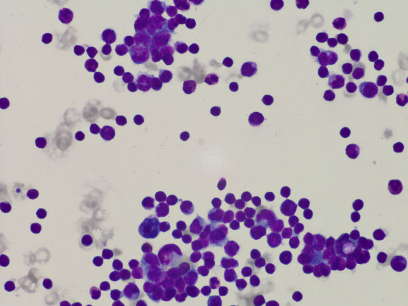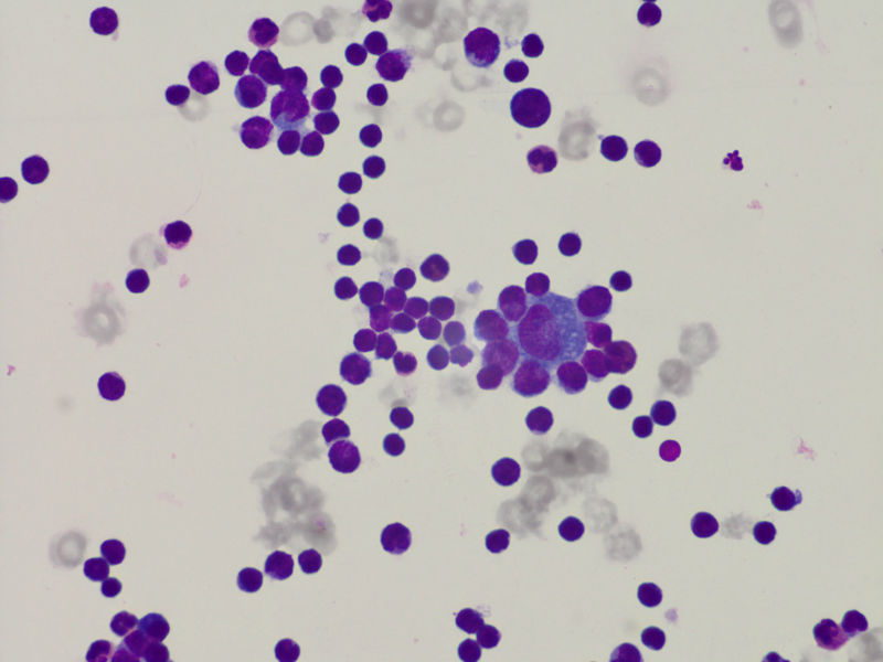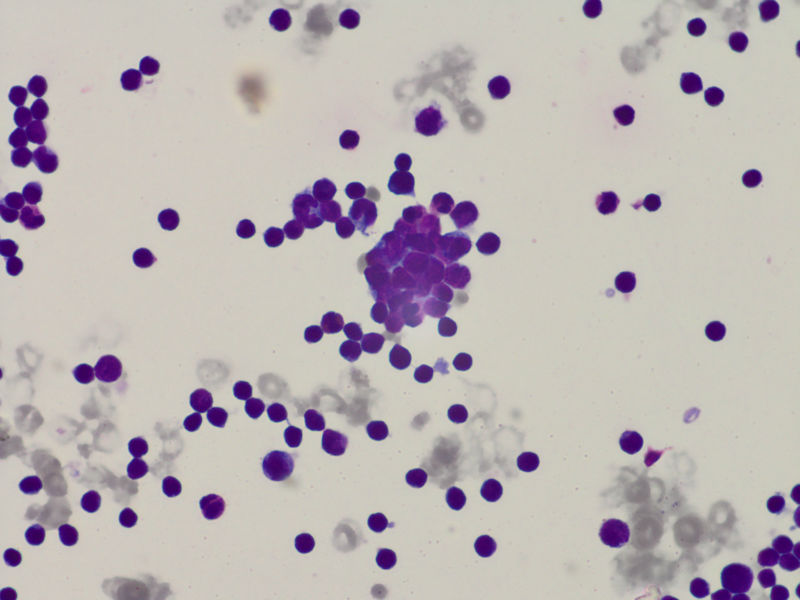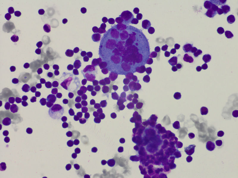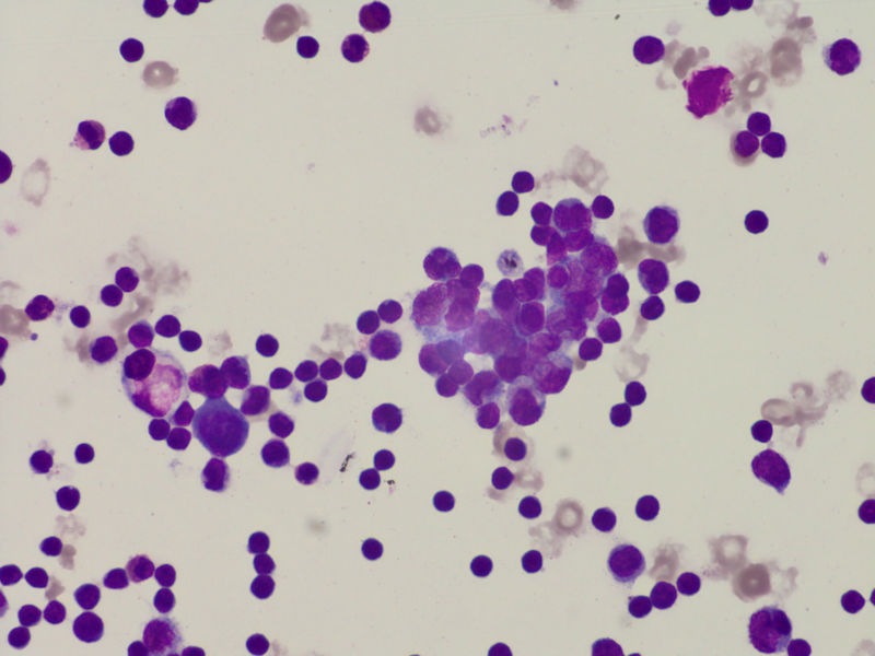 以淋巴细胞为参照物,大点的细胞应该是间皮细胞,有些退变,考虑良性。