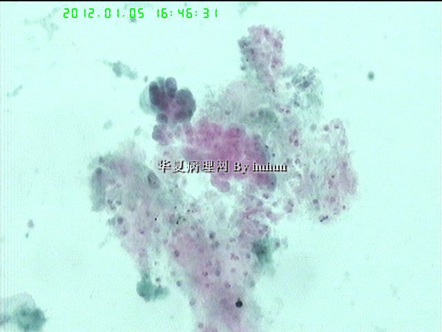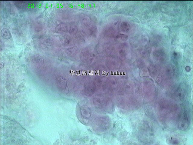 三维立体的结构,核重叠,高核浆比,核仁明显,并可见粘液空泡!
