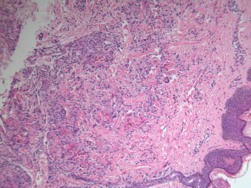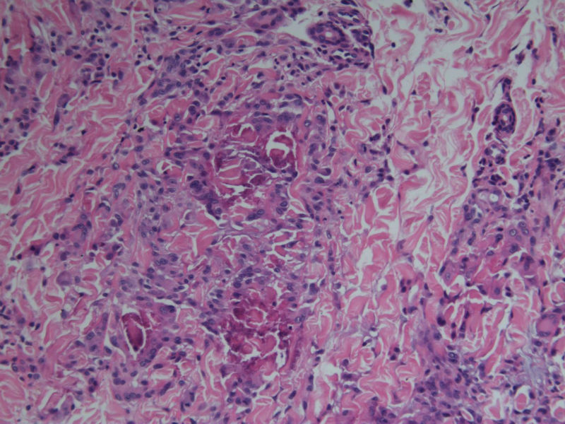 肉芽肿中央不是凝固性坏死,好像是胶原纤维,否为环状肉芽肿或类脂质渐进性坏死