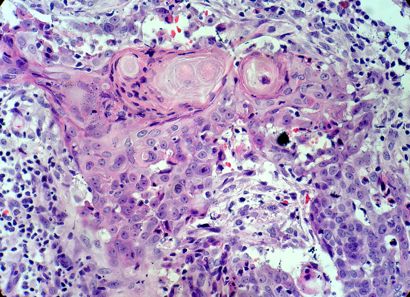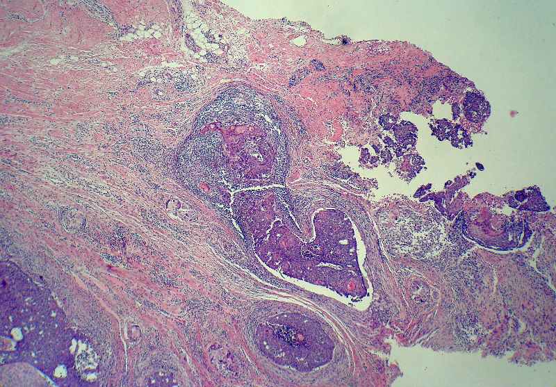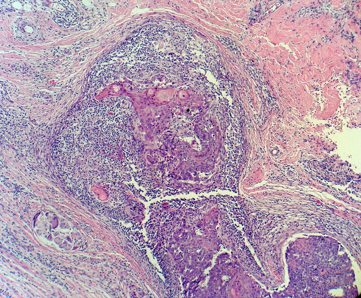 似乎既有腺样结构,也有角化珠形成,还有细胞团内的粉刺样坏死。
