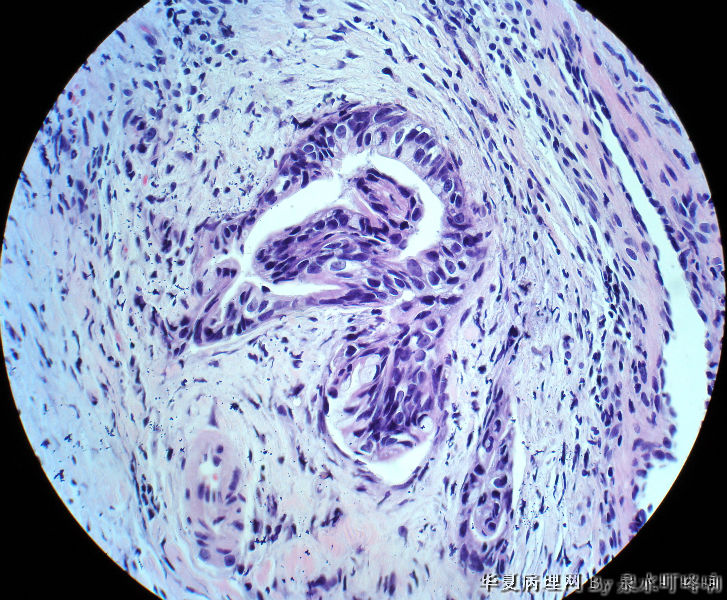 纤维组织中可见异型腺体浸润,诊断腺癌。