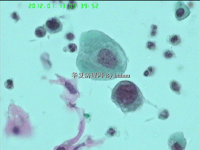 看第一次的片子,只好说出血样本,鳞状上皮细胞总数少于玻片面积10%,标本不满意了。差点漏掉了重要病变。