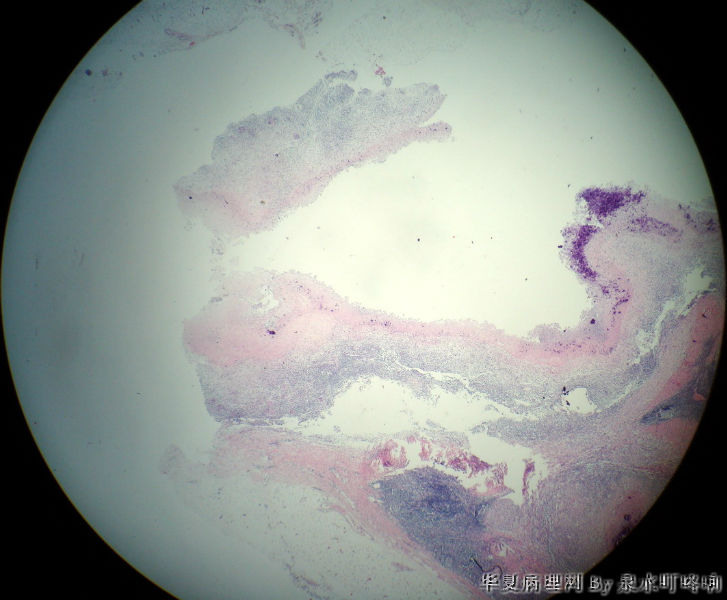 女,3岁,主因左腋窝肿物半年,术中见为肿大淋巴结,淋巴结内有脓液及坏死组织。大体:灰红色组织一块,大小约4.6×3.5×2厘米,切面可见两个囊性区域,内容乳白色浓稠液体。