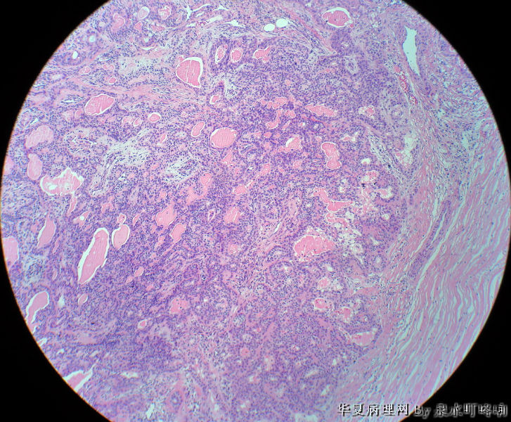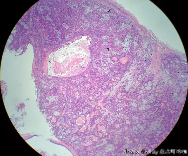 女,38岁,左耳下方肿物,临床诊断:左腮腺肿物。大体:灰白肿物一个,大小约4×3.5×3厘米,切面灰白,质略软,可见多发囊腔。