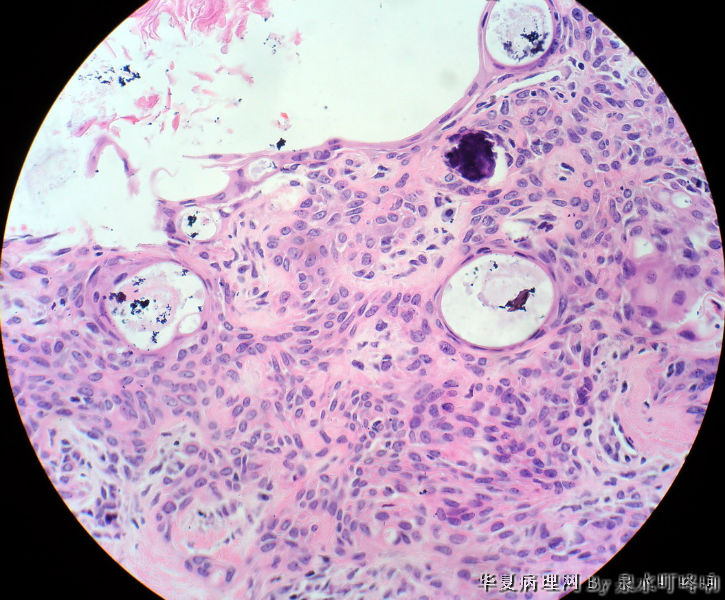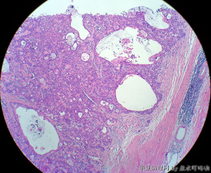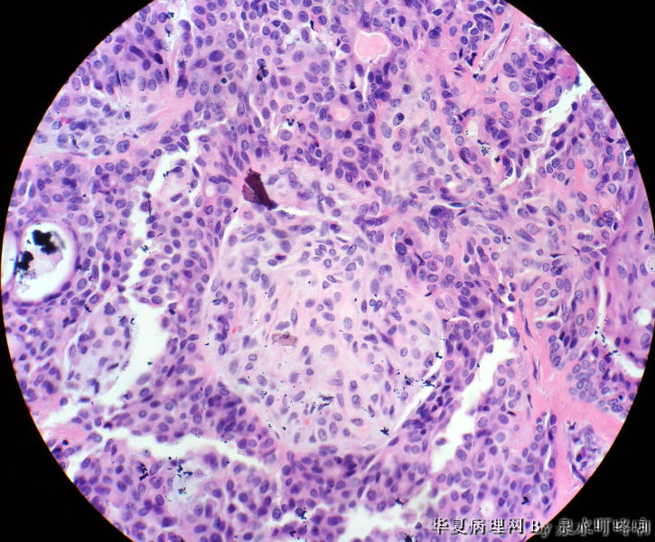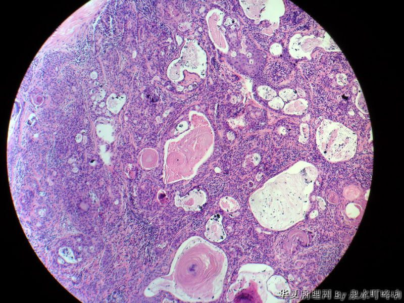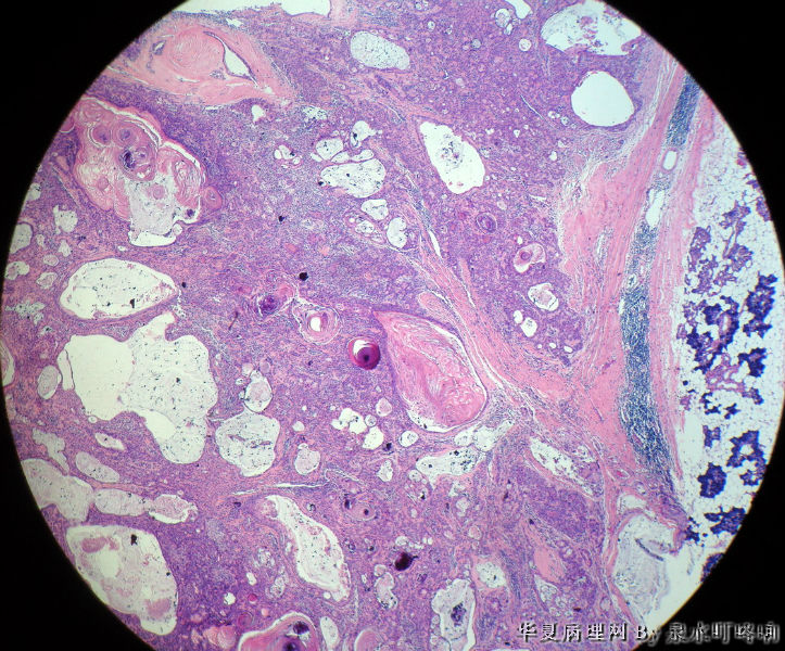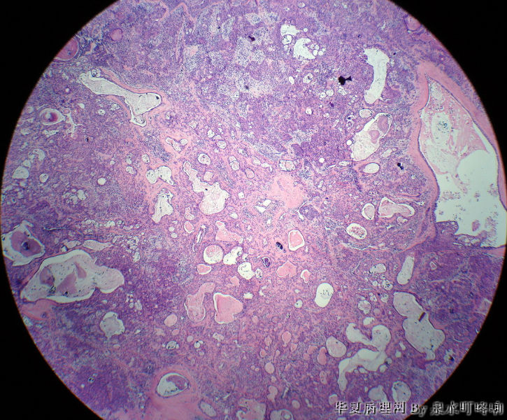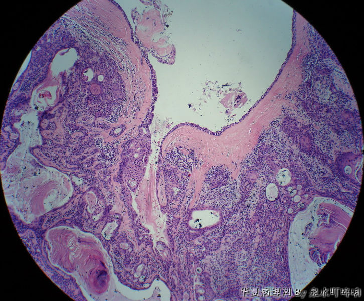 瘤组织由多种上皮成分(腺上皮+肌上皮+鳞化上皮)及黏液软骨样基质构成,多形性腺瘤可以囊性变,多结节状分布。