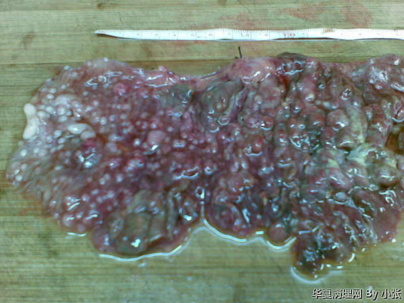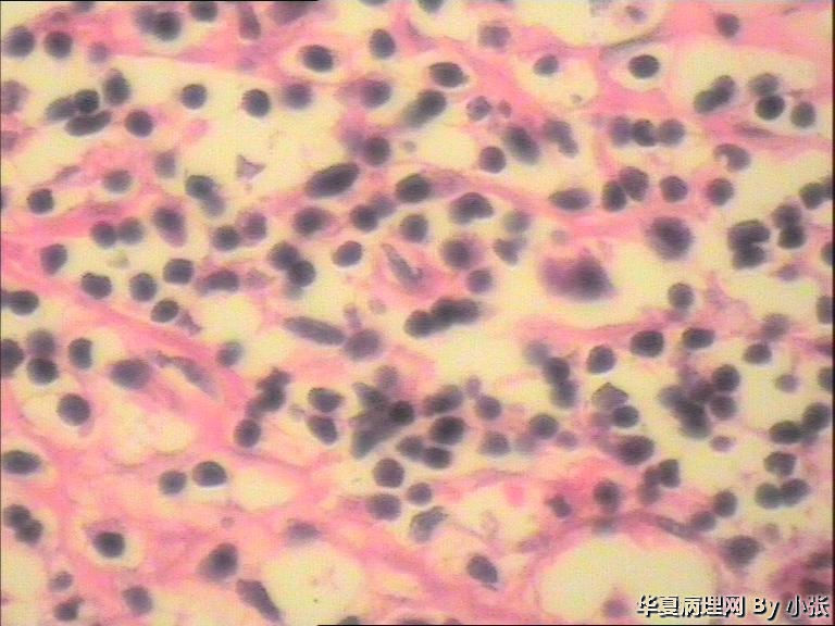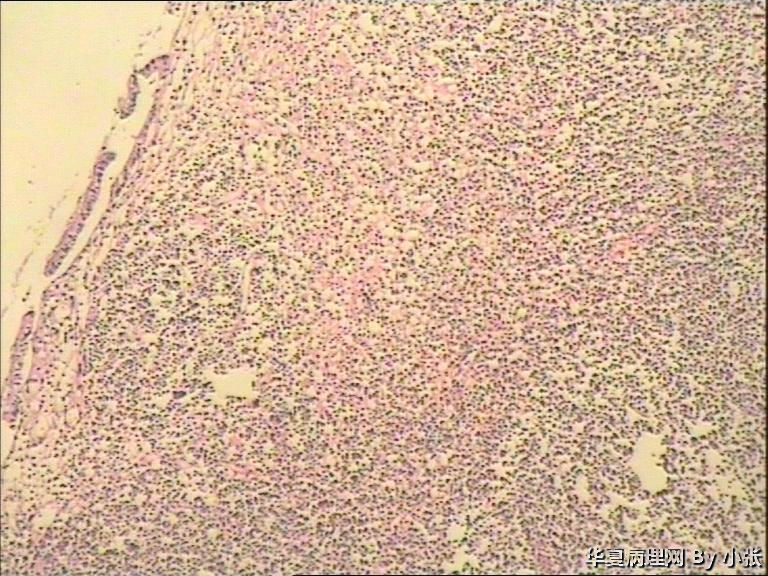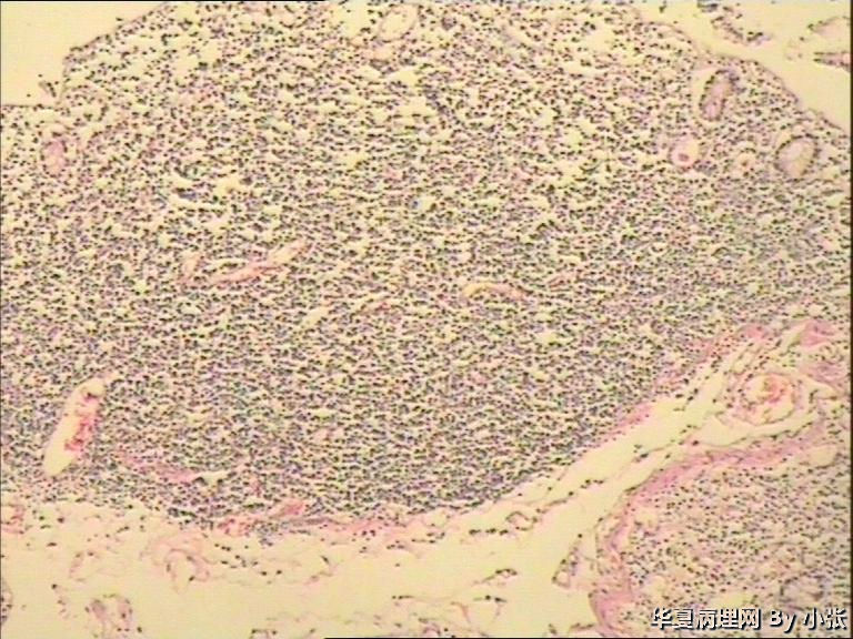 粘膜面布满大小不等的灰白色息肉样物,镜下粘膜面坏死,坏死下面是小淋巴细胞样细胞。系膜淋巴结的组织像好像也被破坏了。各位老师看看这个是什么东东?病人可能不出去会诊了,具体结果有待大家讨论。