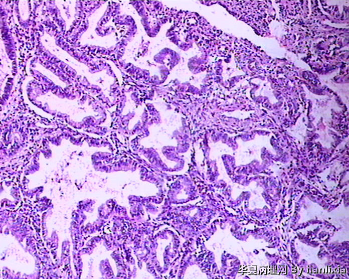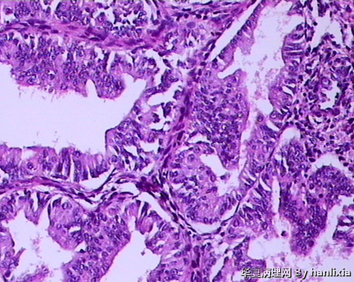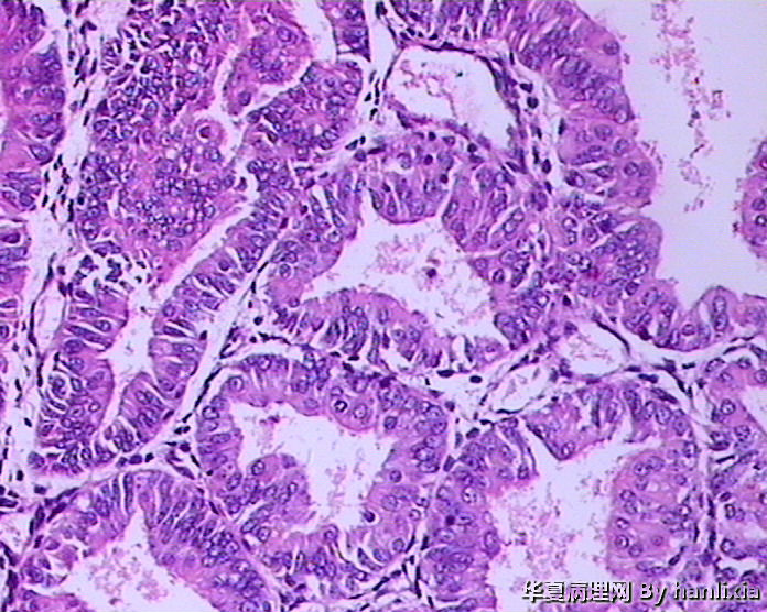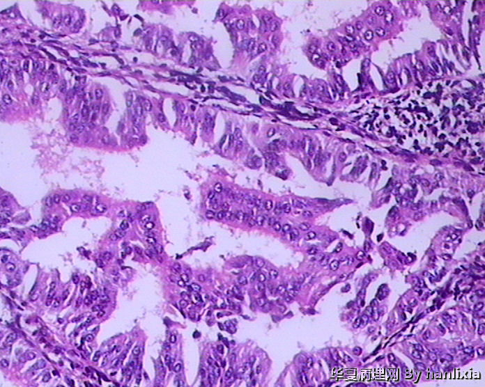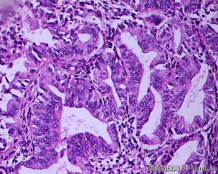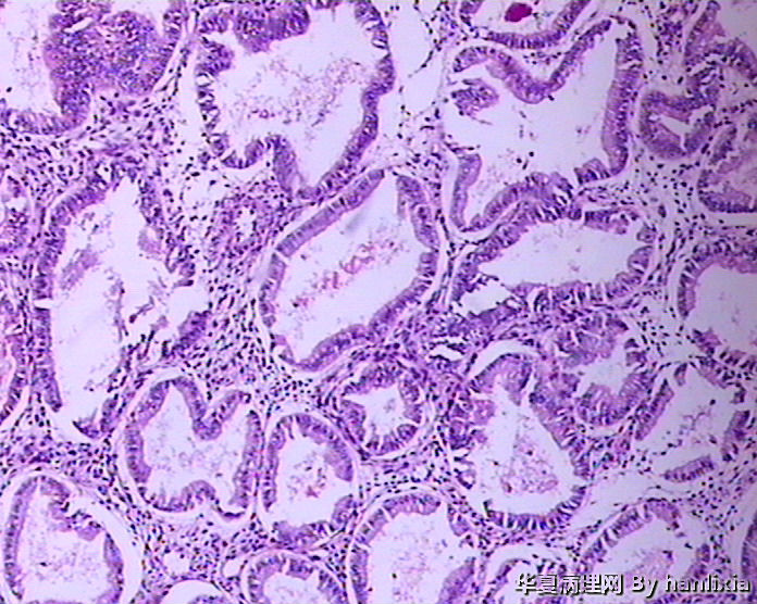腺体密集,背靠背及共壁现象,腺体有成角,腺上皮增生呈多层,有内折,腺体与间质比例大于1:1.