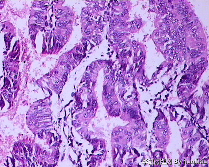 腺体密集,背靠背及共壁现象,腺体有成角,腺上皮增生呈多层,有内折,腺体与间质比例大于1:1.
