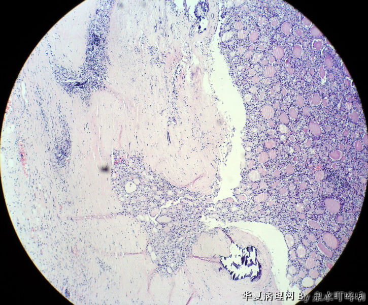 甲状腺滤泡性肿瘤,可见包膜及血管侵犯,考虑滤泡癌。