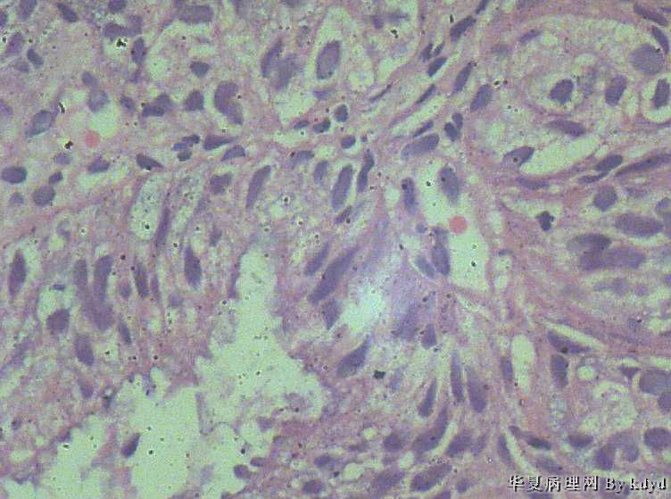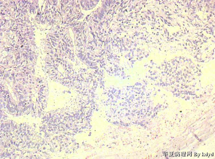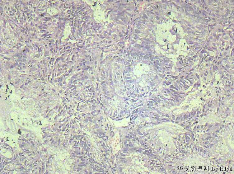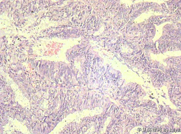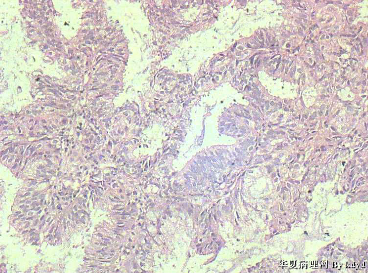 宫内膜样癌(高分化)。组织腺体拥挤、背靠背、血管纤维轴心乳头状,间质细胞消失代之纤维。