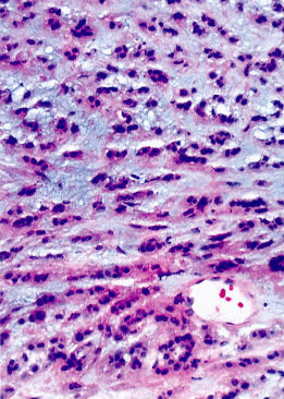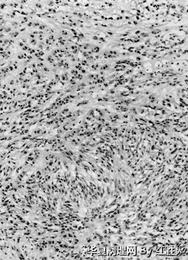2、肿瘤细胞呈梭形,少数呈圆形,上皮样,胞浆红染,可见致密区及稀疏区;