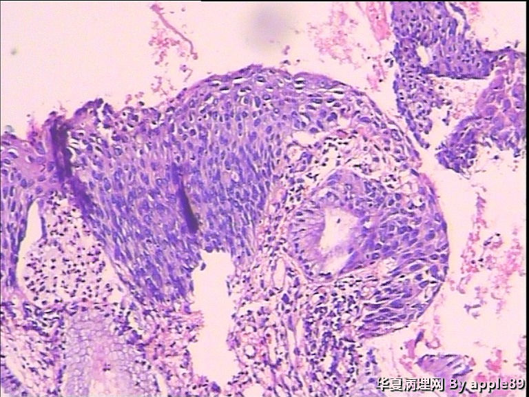 这个病人活检的片子补切后我会再看看,必要的话再采几张图上来,TCT看到很多角化珠样的东东,但是活检一点都没有,不知道是没有钳到还是没切到还是本来就没有。如果这个病人有进一步的治疗如leep刀的话,我会继续关注。
