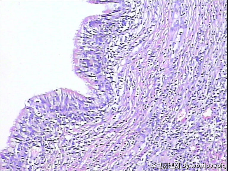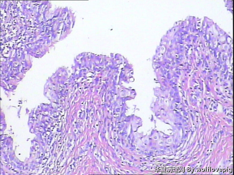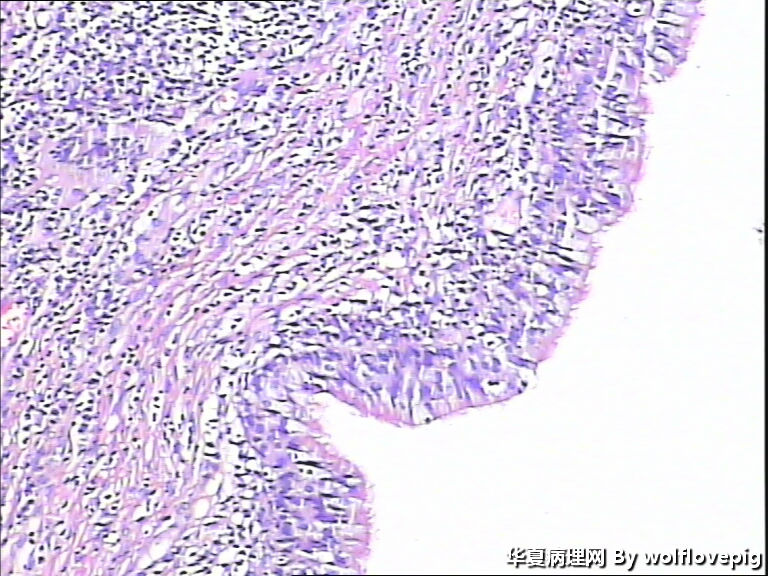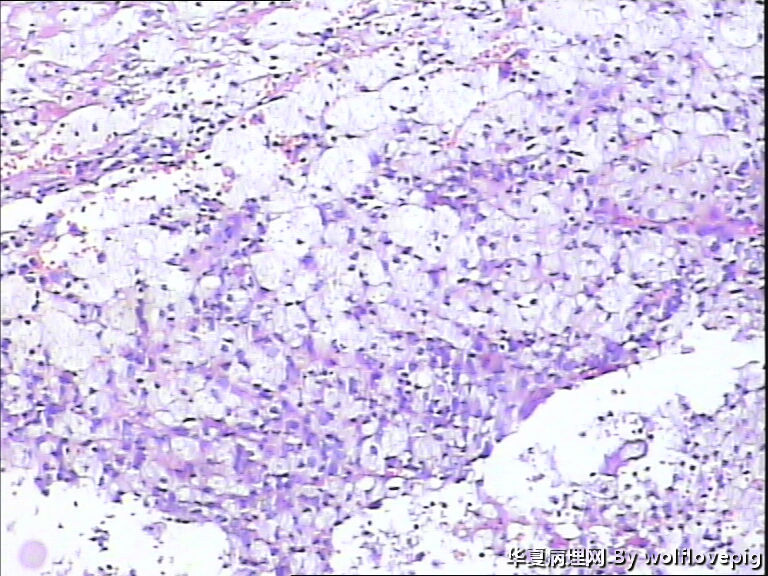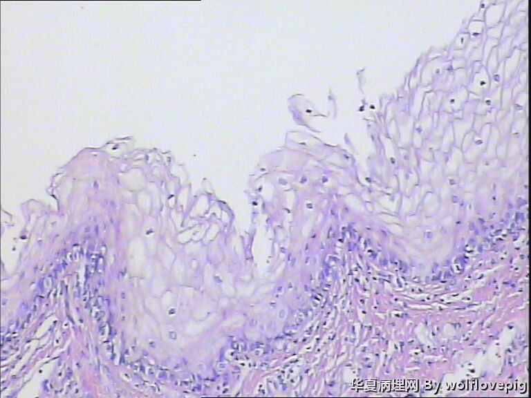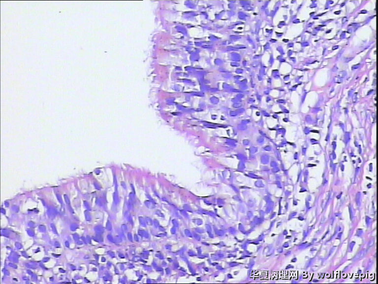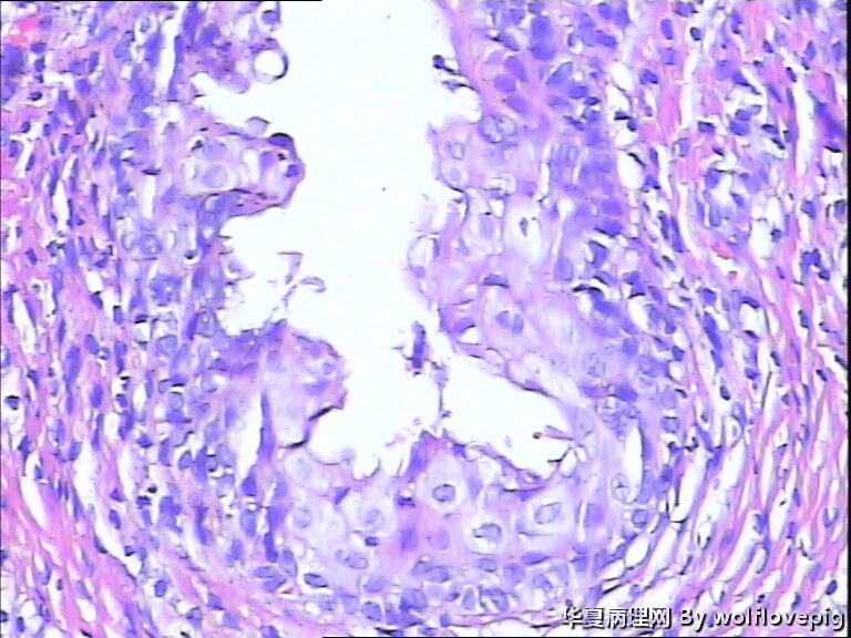 2,组织学上,粘液性囊肿含有与宫颈内膜或阴道腺病一样的粘液性上皮内衬,少数情况下可出现鳞状上皮化生。也有报道有些病例出现纤毛细胞,可以与粘液上皮混合存在。