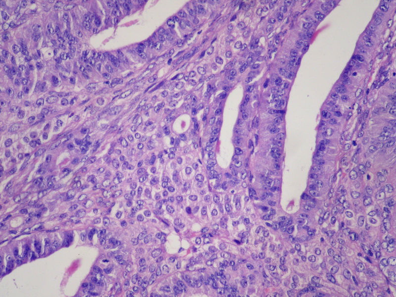 高分化子宫内膜样腺癌,中间那点可能是高雌激素下卵巢间质反应,也可能是伴性索间质的成分。如果片中只有那些我认为可以忽略不计,如果很多要深究一下。