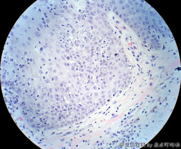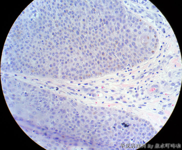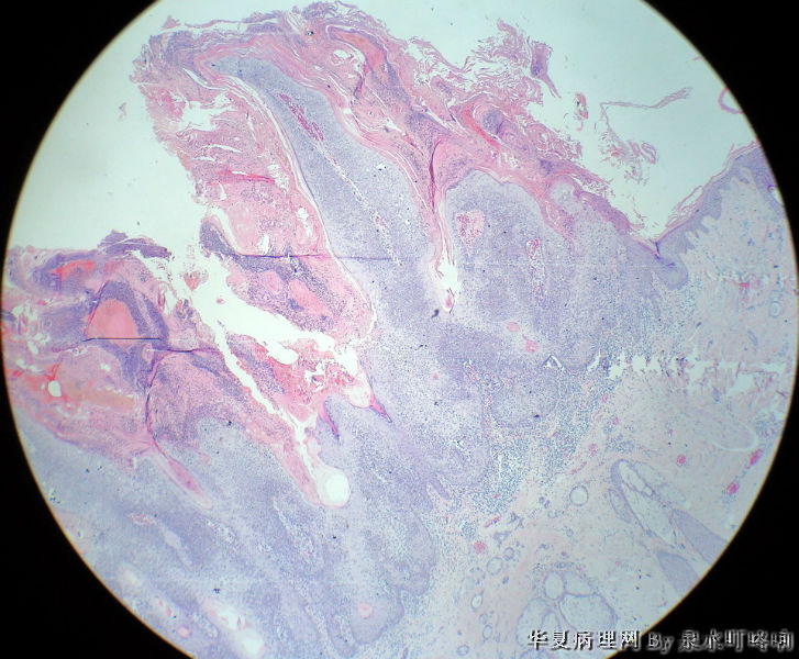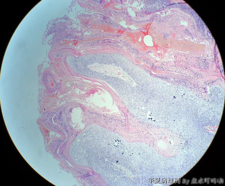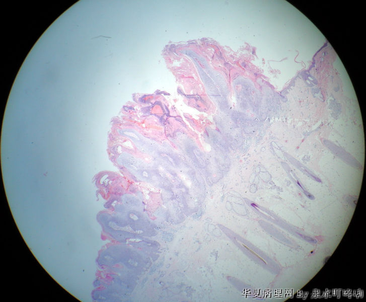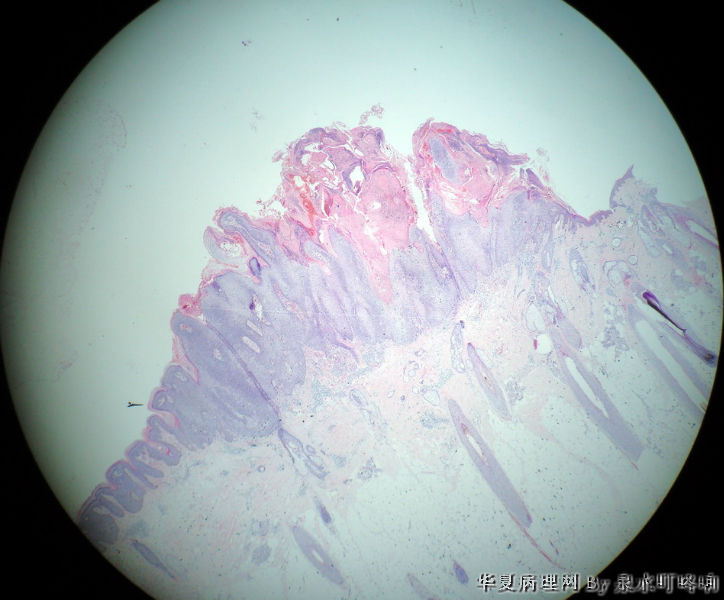 倾向脂溢性角化病(上皮角平坦)。  未见病毒感染的空泡细胞,也未见明显上皮角辐辏现象不考虑寻常疣
