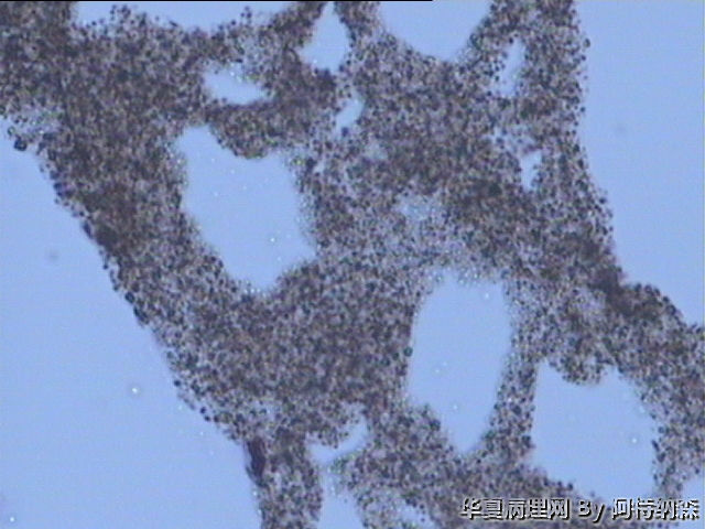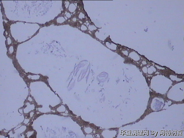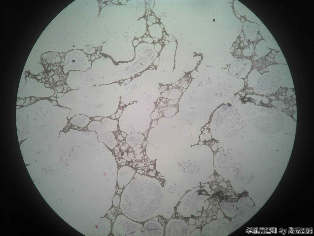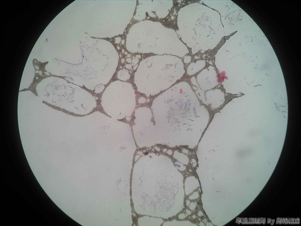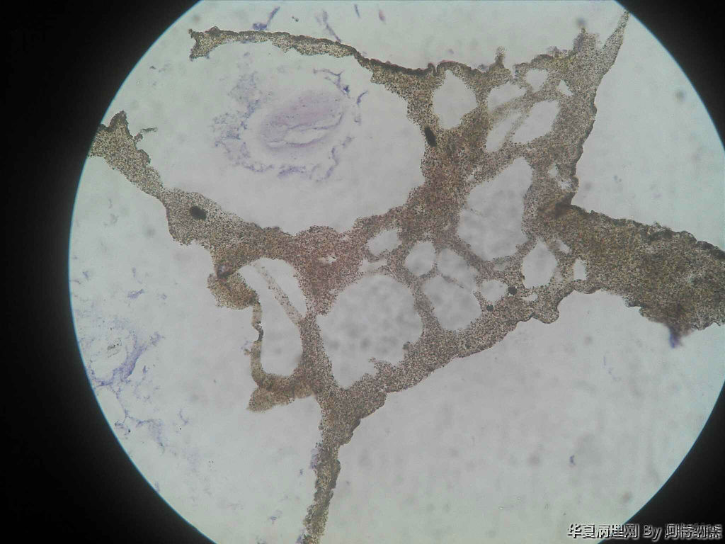 镜下未见任何细胞成分,只有蜂窝状结构,高倍下由细微的沙粒样物组成。蜂窝腔内可见蓝染的粘液样物。