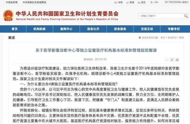 1 月 25 日,国家卫计委下发通知《关于医学影像诊断中心等独立设置医疗机构基本标准和管理规范解读》,再次确认了这四大科室医护人员的一直担忧的问题很有可能要发生了。