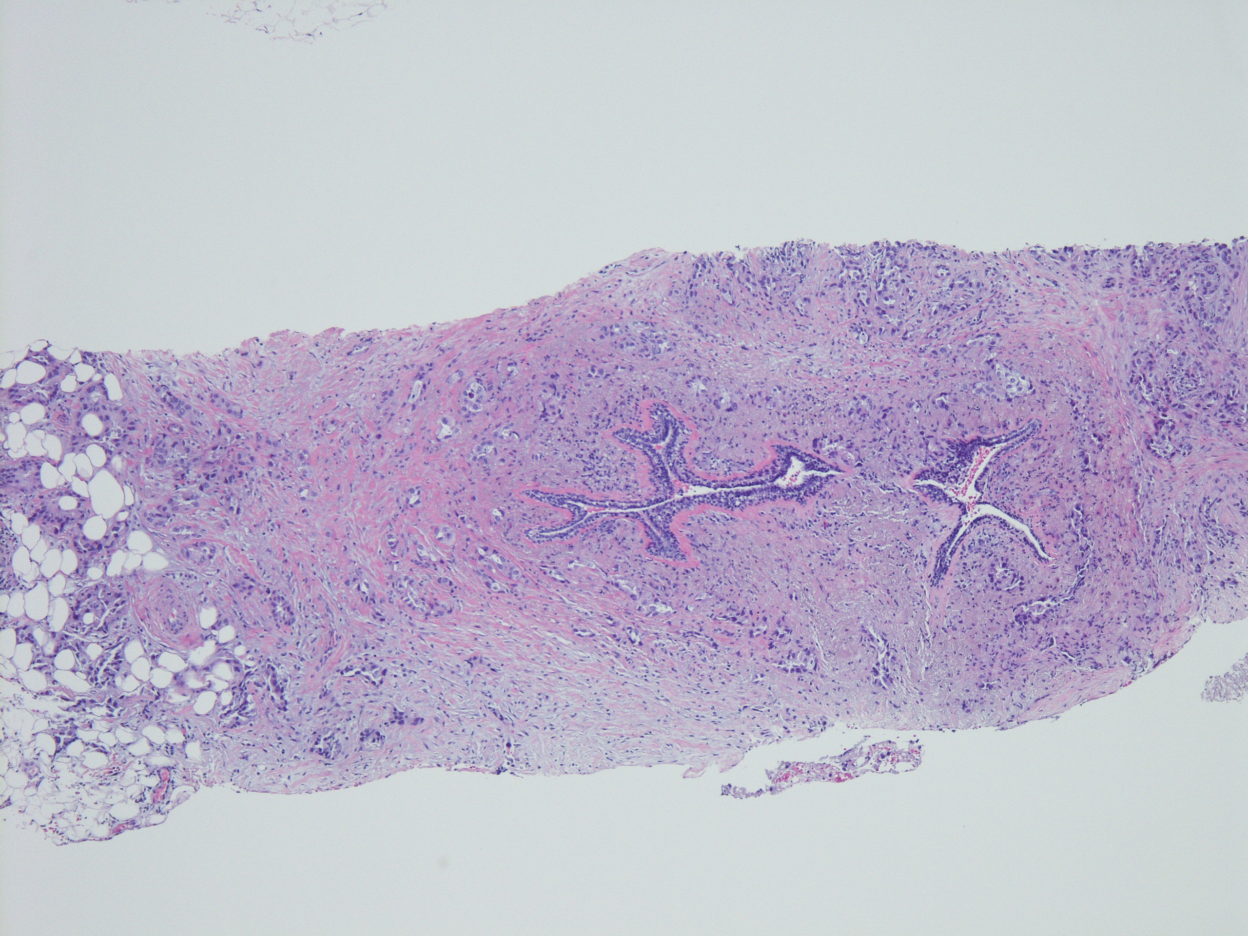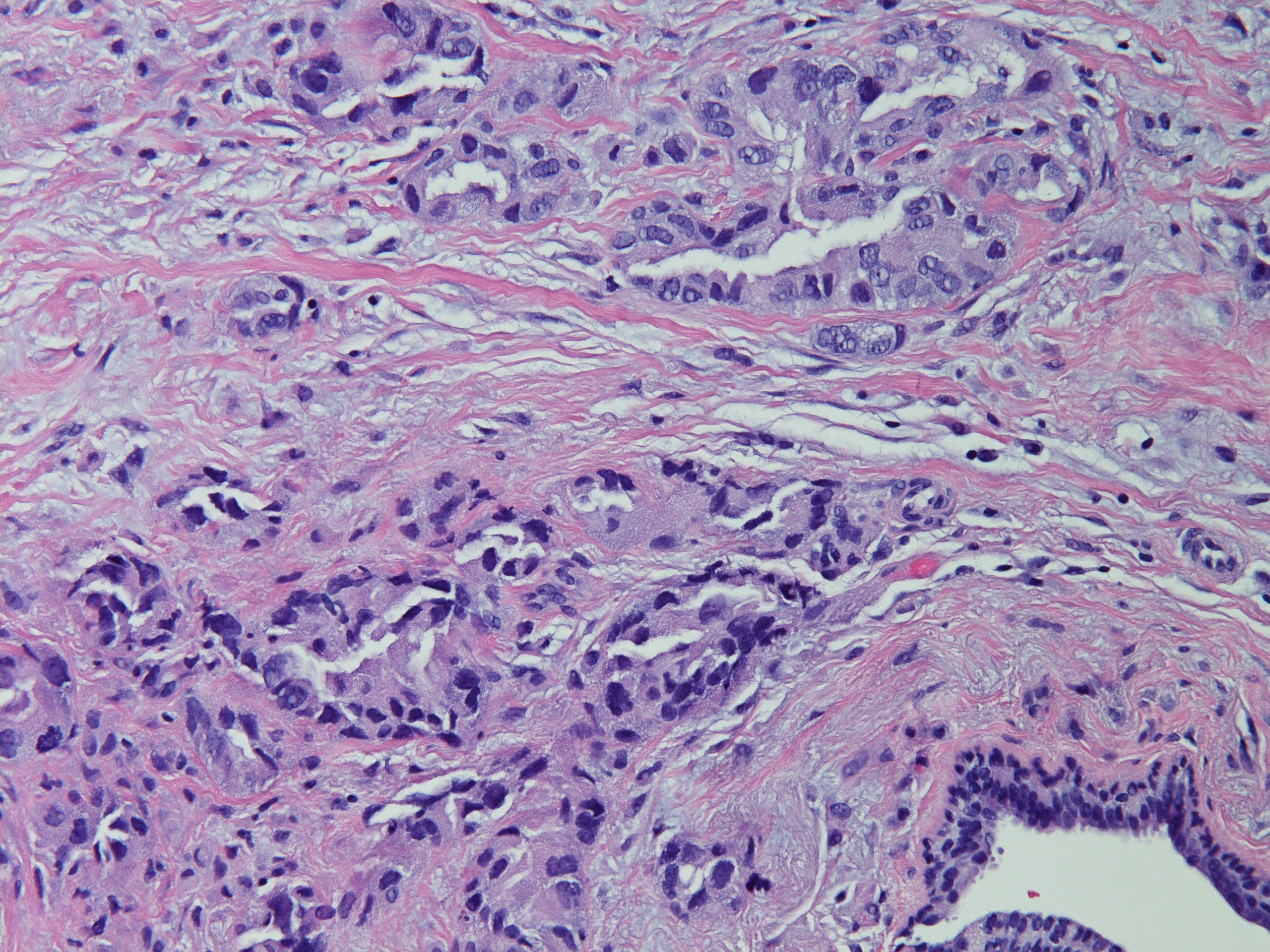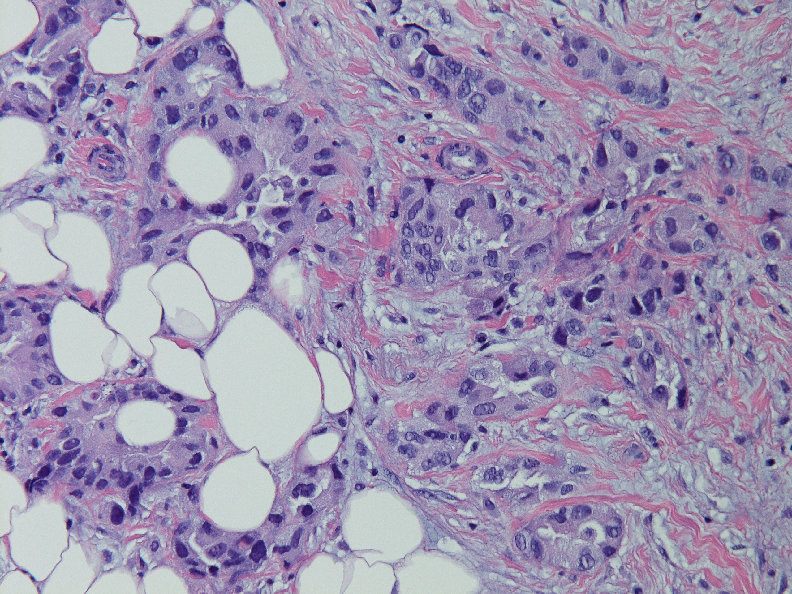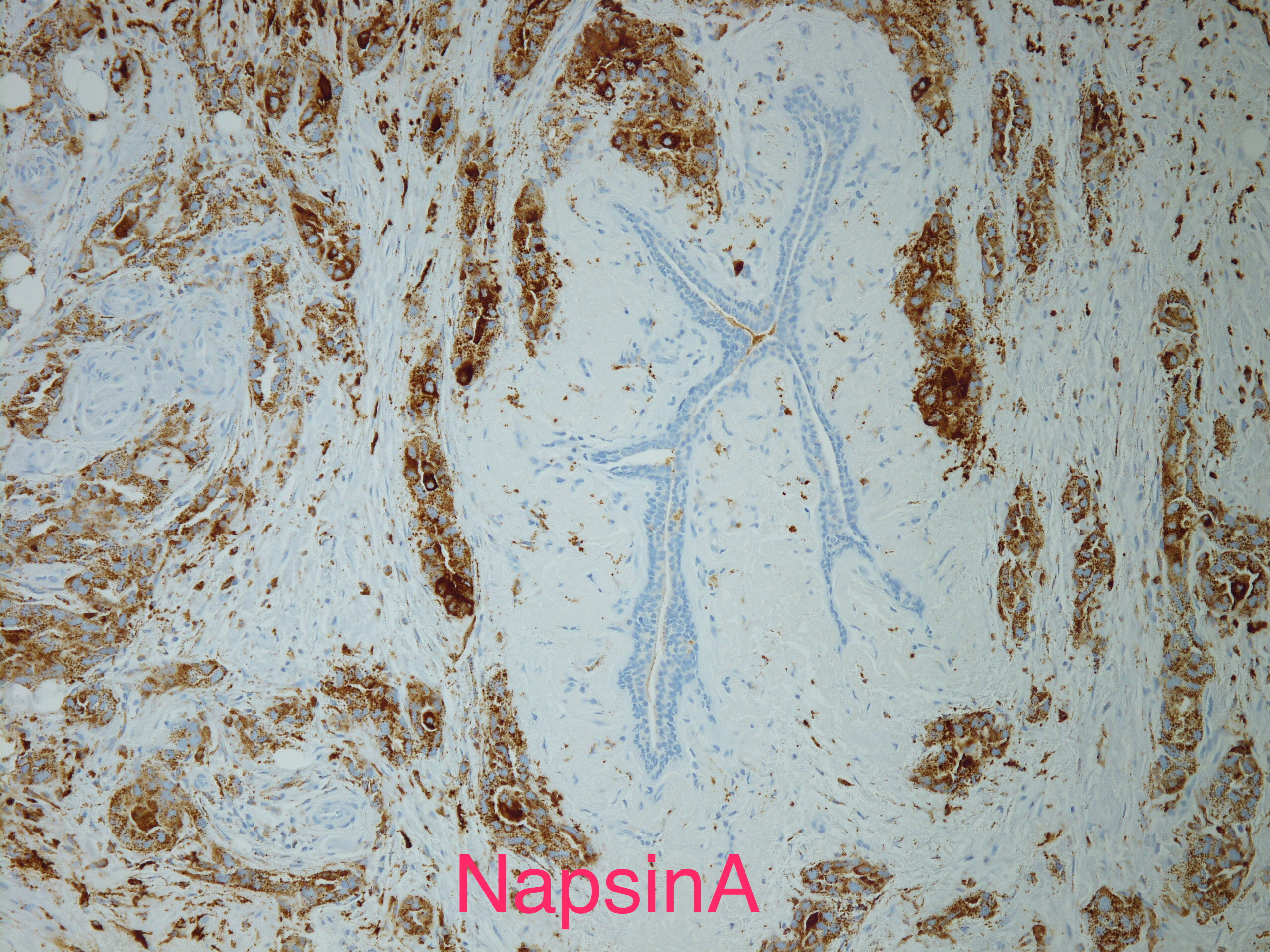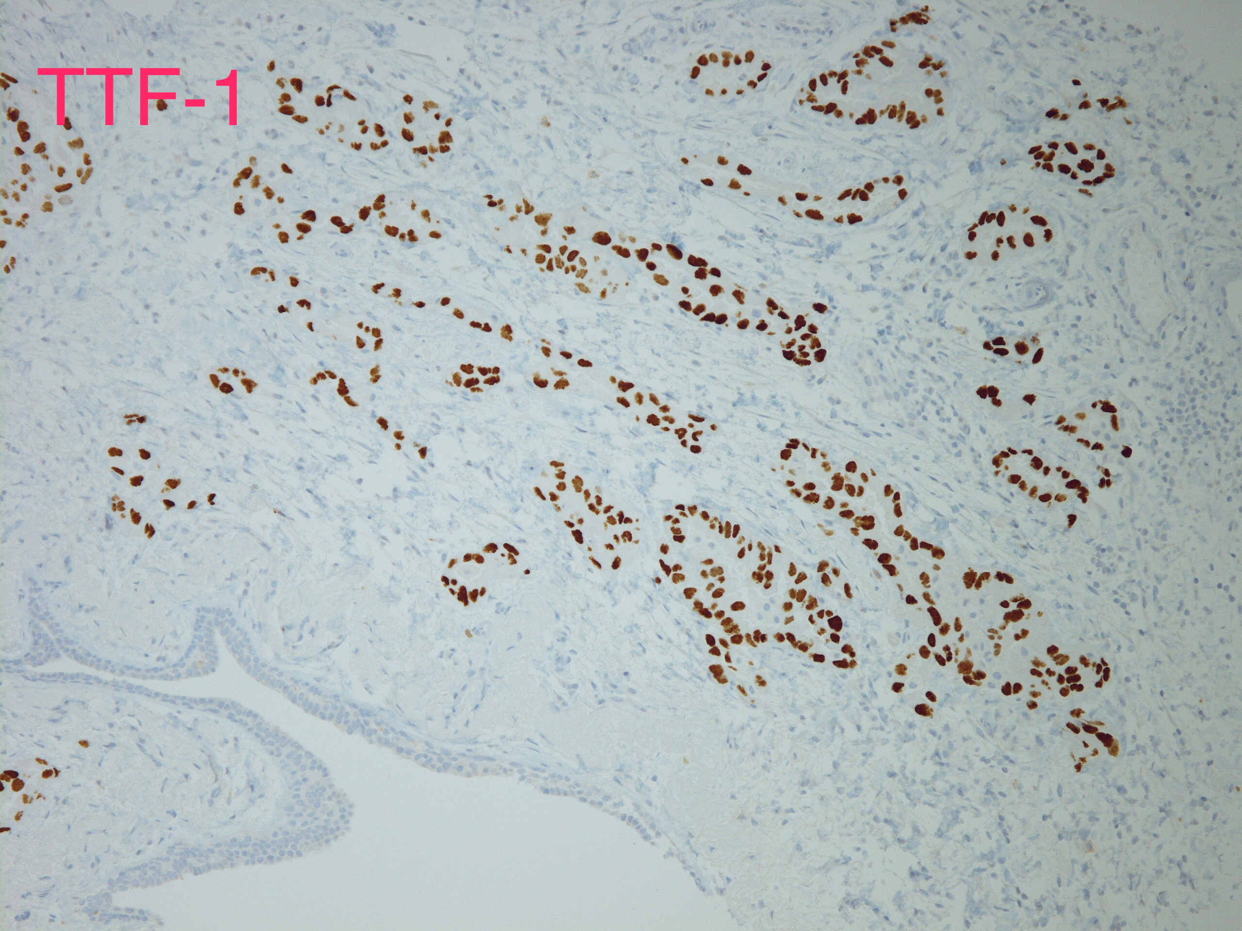 AddendumImmunostains were performed on the block. The tumor cells are positive for CK7, TTF-1, focally and weakly positive for ER, negative for PR and GATA-3, GCDFP, mammaglobin. The immunostain results support this is a metastatic carcinoma from pulmonary primary. This patient reportedly has metastatic adenocarcinoma of lung origin.AddendumNapsin A is positive, supporting a lung primary.