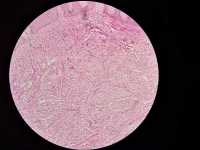带皮组织一块,皮肤上见一灰红色区域,S:1.5X1.2CM,皮下组织厚0.3CM,切面灰黄色,质地中等。