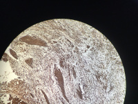 灰红组织一块,其上见直径0点5厘米灰白结节多个