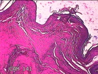 灰白暗红色组织.3x0.8x0.3cm一块,表面糜烂,切面灰白暗红色,质中。