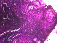 灰白粉红色组织1.3x1.2x0.3cm一块,表面光滑,切面灰白粉红色。质软。