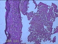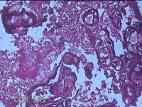 灰白暗红色胎盘组织19x15x2.3㎝一个,表面光滑,血管清晰,颜色发暗,绒毛面结节状,轻度糜烂,表面有少许凝血块,切面见绒毛内有部分淤血,边缘蜕膜可见多个小血肿,脐带49x1.3x0.8㎝,切断脐带,见脐血管内有凝血块。