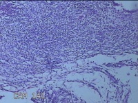 灰白暗红色囊壁样组织5.3x2x1.3cm一堆,表面糜烂,因已切开,囊内容物已流失,囊壁厚0.1cm。