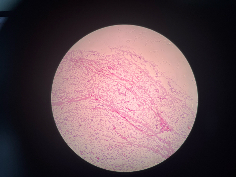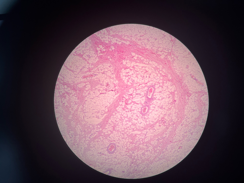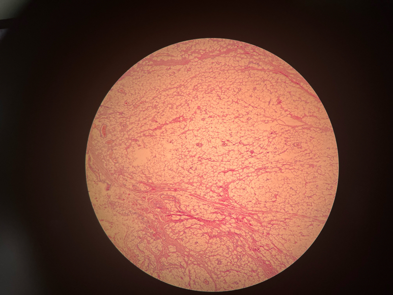 灰红肿物一个,大小约1.5✖️1.1✖️0.2cm ,包膜完整,质软