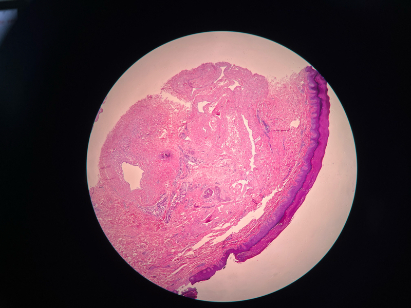 女,51岁,拇趾肿物,术中见拇趾节处一肿物,术中破裂,内有清亮液,送检灰白组织一个,约0.5✖️0.3✖️0.2cm