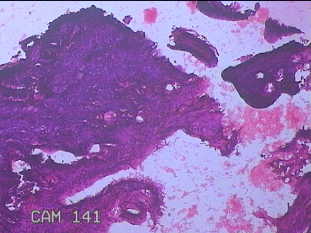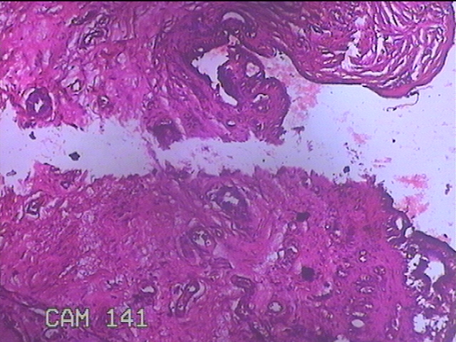 灰白暗红色囊性包块1.5x1.2x0.7cm一个,表面光滑,部分已切开,囊内容物已流失,囊壁厚0.1cm。