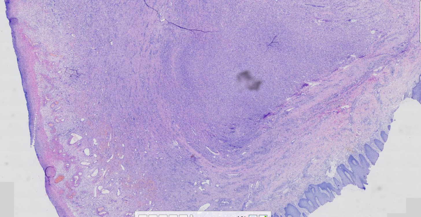 带皮肤肿物,体积3*2.5*2cm,表面部分瘤体被皮肤包裹,切面灰白质中。
