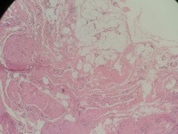 送检组织2.0x(0.5~1.0)x(0.1~0.3)厘米,上见少量脂肪组织。