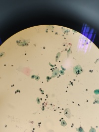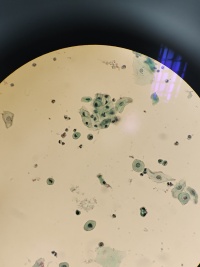 发热一天来的,CT:左侧肾盂及上段输尿管扩张,左肾门及腹膜后见淋巴结影。老师们,有些核大细胞,中度核异质?