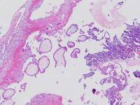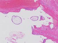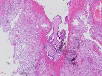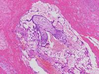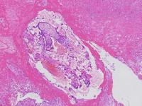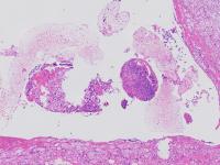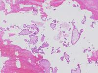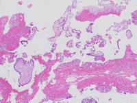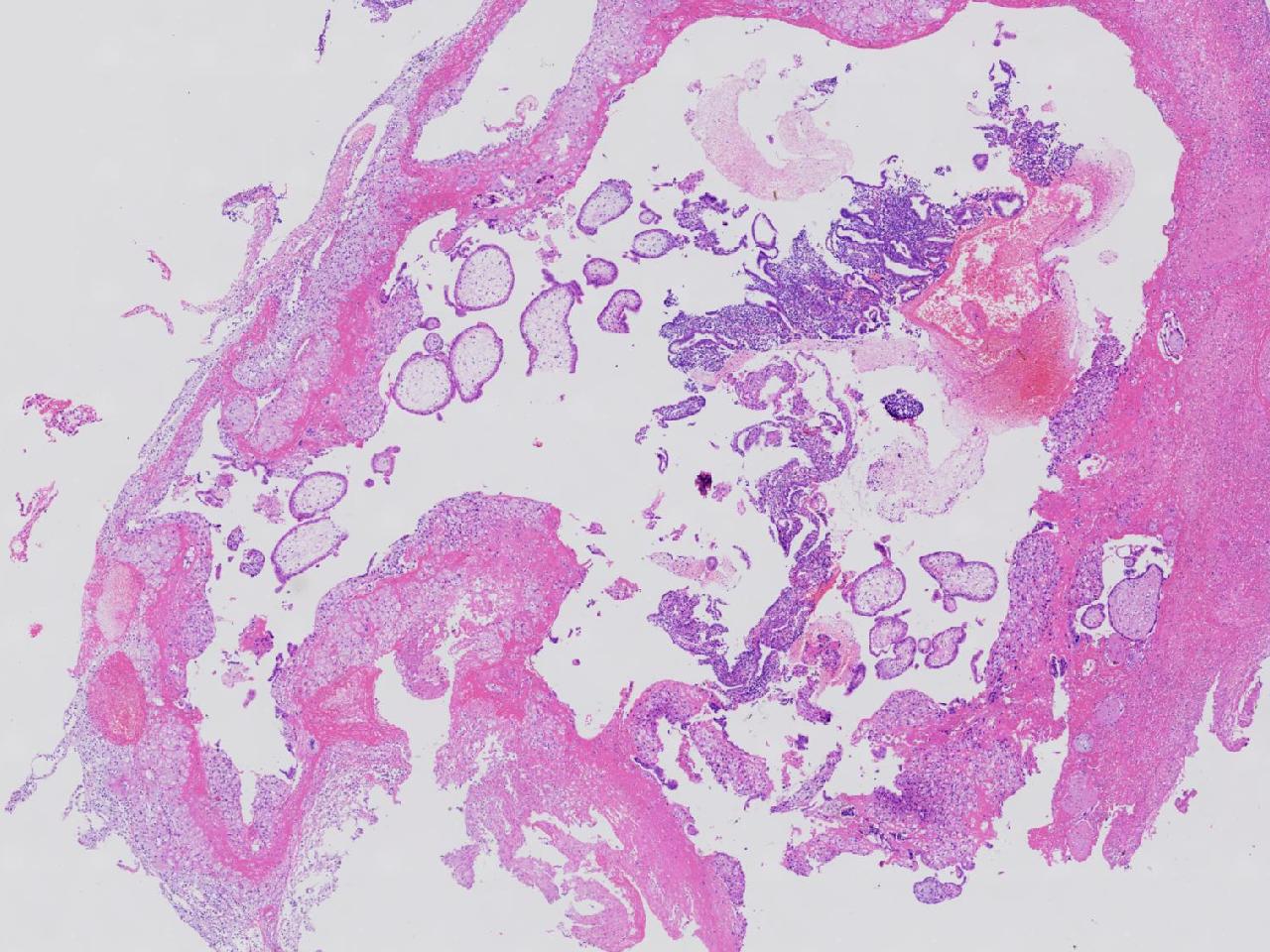 灰粉色不整形软组织多块,4X3X3厘米,部分为血凝块。
