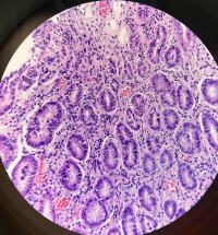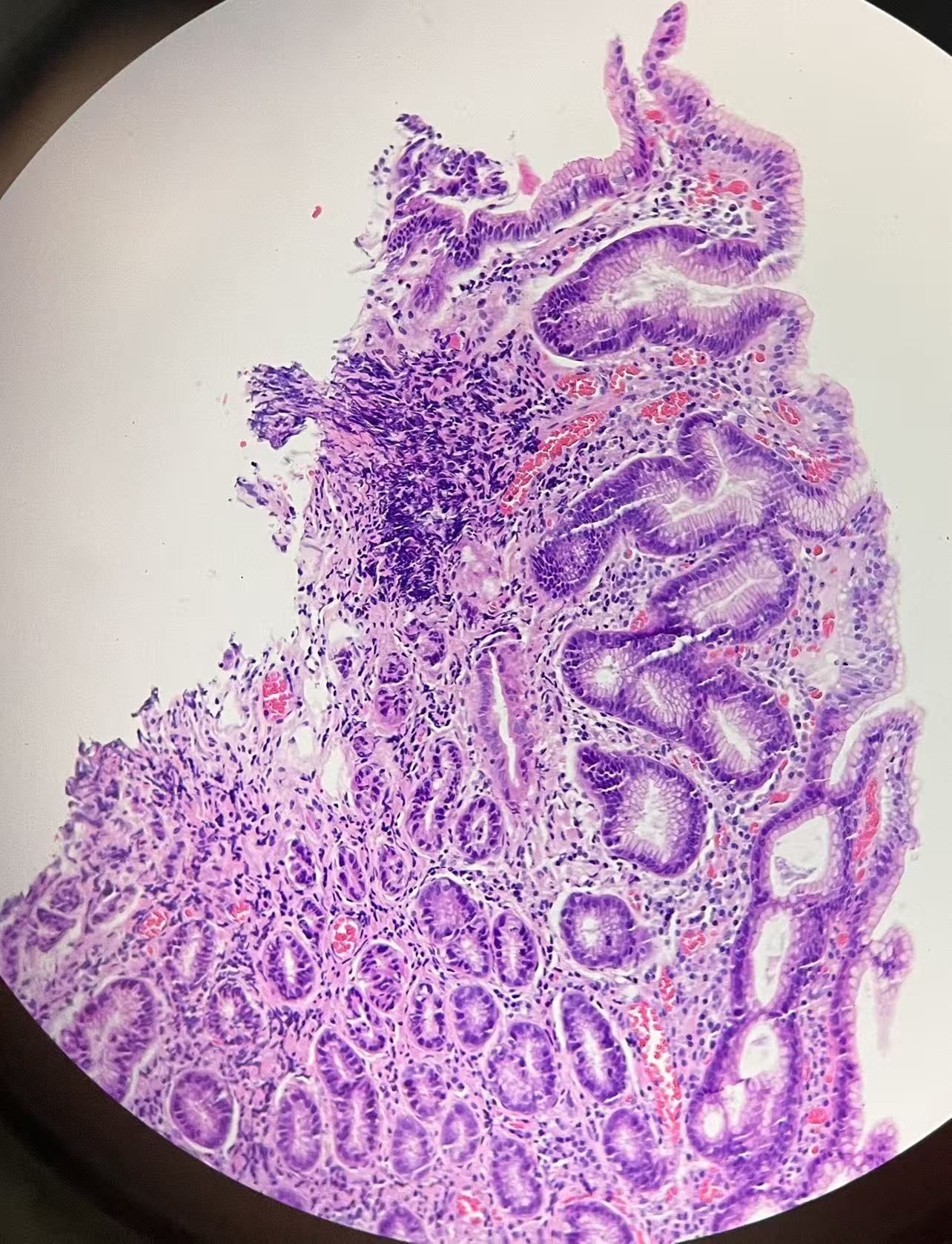 胃窦粘膜光滑,红白相间,见两处白苔溃疡。